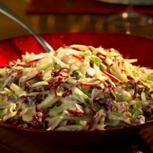 - Mélanger romaine, endive, fenouil, coeurs de palmier, radicchio, pomme et radis dans un grand saladier.